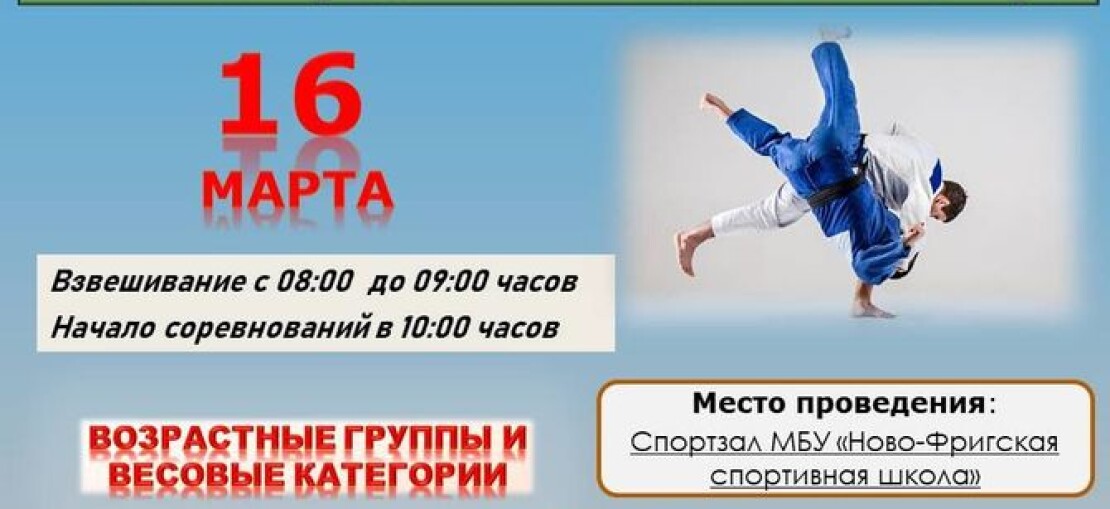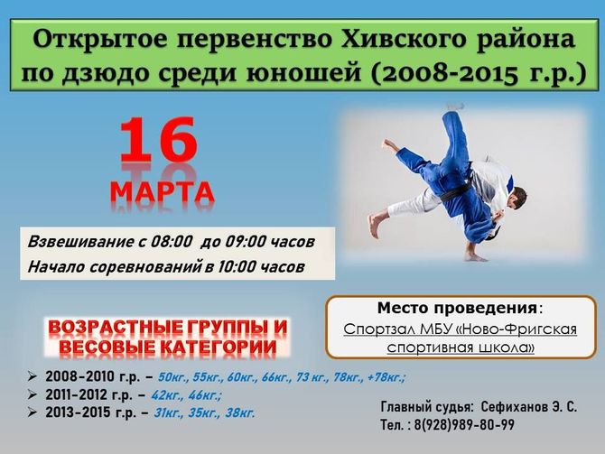 16 марта 2025 года в с. Новый Фриг состоится открытое первенство Хивского района по дзюдо среди юношей (2008-2010 г.р., 2011-2012 г.р., 2013-2015 г.р.).