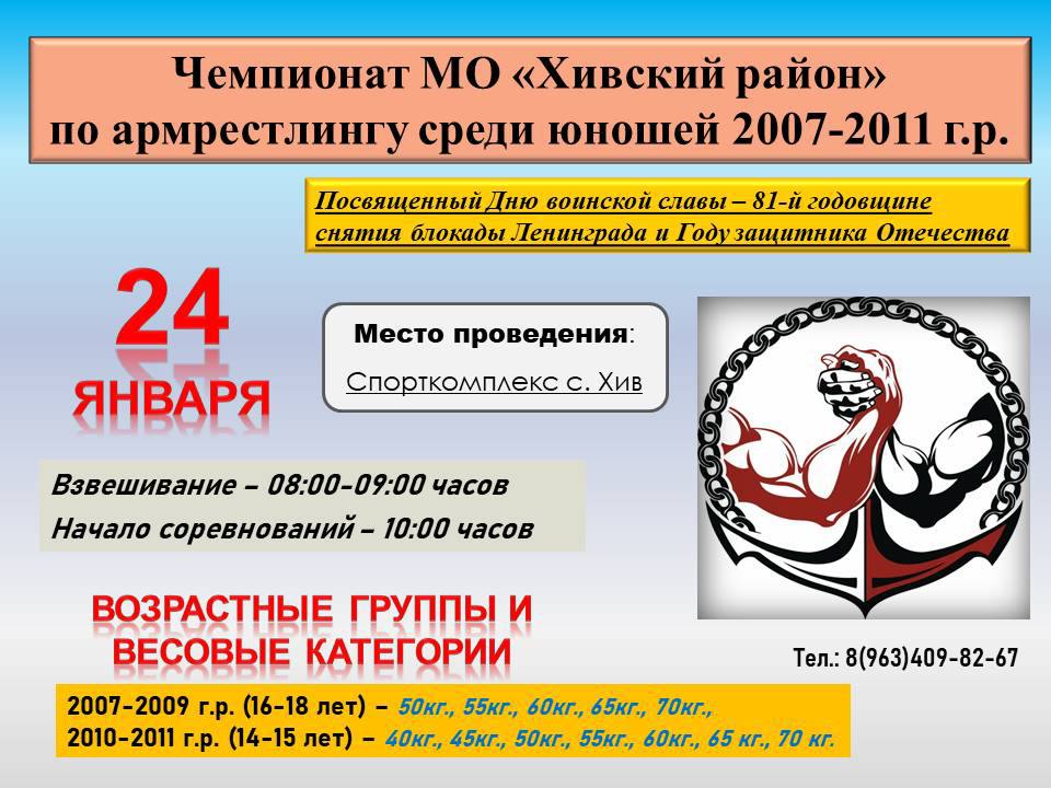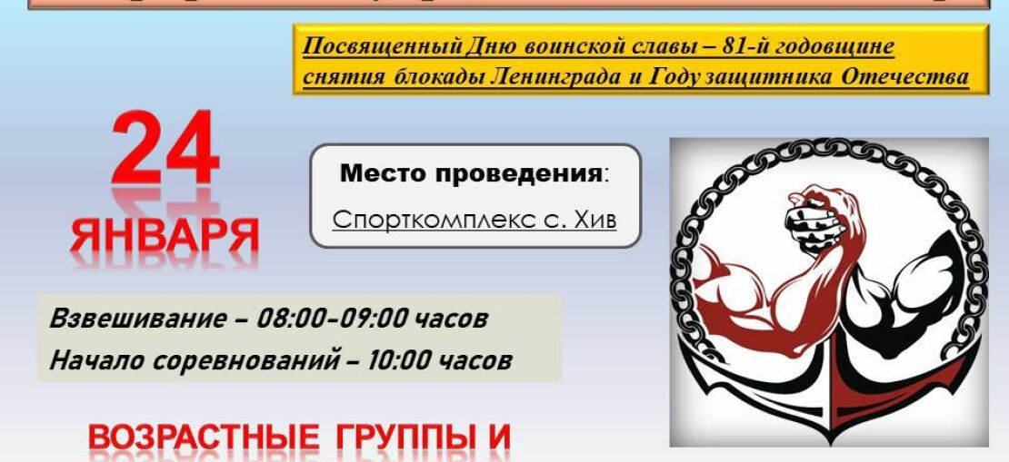 Соревнования проводятся 24-го января 2025 г. в спорткомплексе с. Хив в двух возрастных категориях (14-15 лет и 16-18 лет) по следующим весовым категориям:2006-2008 г.р. (16-18 лет ) – 50кг., 55кг., 60кг., 65кг., 70кг. (Провес 2кг.)2008-2010 г.р. (14-15 лет) – 40кг., 45кг., 50кг., 55кг., 60кг. (Провес 2кг.)